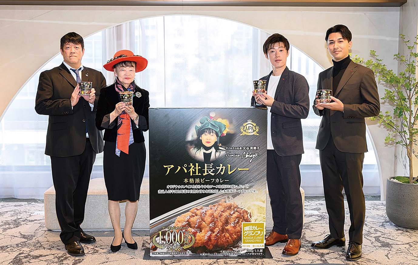 発売に先駆け、12月9日(火)にはアパグループ東京本社にてメディア向けの試食会を開催しました。アパホテルのホテル社長と元谷専務、日清食品グループからは、カップライスのブランドマネージャー中村様と食品開発部の野村様にご登壇頂き、「アパ社長カレーメシ」の魅力や開発経緯についてお話をいただきました。