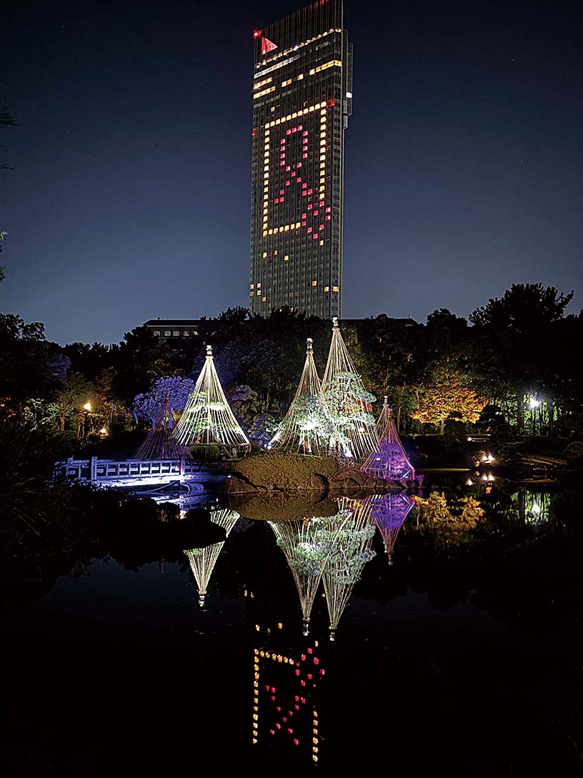東京ベイ幕張に隣接している「美浜園」からの風景は、イルミネーションが池の水に綺麗に反射し、幻想的な世界が広がりました。