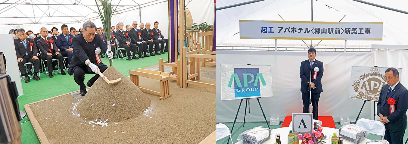 2月17日には、福島県にてアパホテル〈郡山駅前〉(全249室)の起工式を執り行いました。同案件は隣接する既存棟と一体運用を行う「隣地政策」の一環であり、合計338室体制へと規模を拡大。あわせて大浴場を新設することで、宿泊客の利便性と客室単価の向上を図ります。